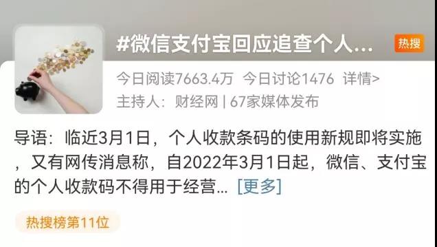 據(jù)媒體報(bào)道,近期有網(wǎng)傳消息稱,自2022年3月1日起,微信、支付寶的個(gè)人收款碼不得用于經(jīng)營(yíng)性收款。不僅如此,近4年的數(shù)據(jù)將被追查,一旦數(shù)額較大需按4.5%補(bǔ)稅,還要繳納滯納金和罰款。對(duì)此,微信和支付寶回應(yīng)稱,追查個(gè)人收款碼近4年數(shù)據(jù)的說法為謠言。